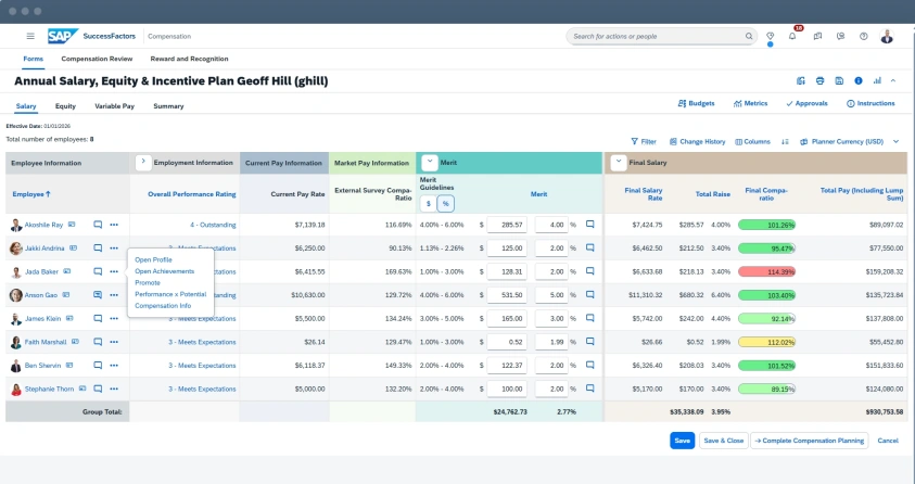 Także tutaj znaczenie ma nie tylko sama polityka, ale i sposób jej stosowania. SAP SuccessFactors Compensation może wspierać menedżerów, dostarczając im dane, kontekst i jasne ramy decyzyjne. Dzięki temu rozmowy o wynagrodzeniach są mniej improwizowane, a bardziej oparte na faktach i przyjętych zasadach.