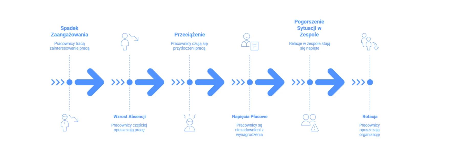 Zazwyczaj wcześniej pojawiały się już pierwsze sygnały. Spadek zaangażowania, większe przeciążenie, wzrost absencji, pogorszenie sytuacji w zespole, brak ruchu czy zmiana nastrojów pracowników. Każdy z tych sygnałów osobno może wyglądać niegroźnie. Razem zaczynają tworzyć wzorzec, którego nie warto ignorować.