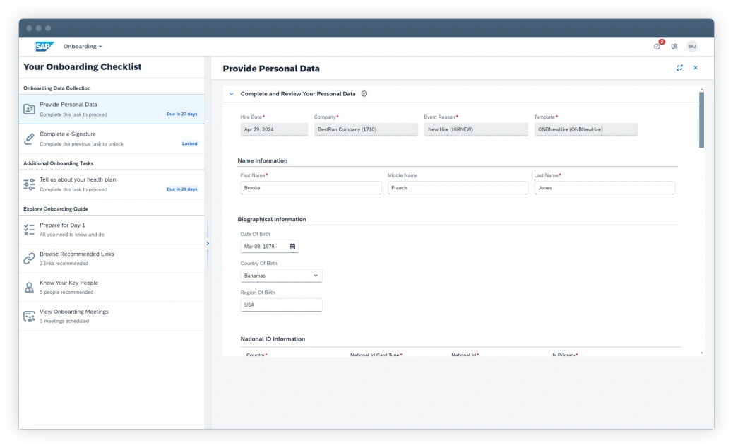 W połączeniu z Employee Central (jako źródłem danych o pracowniku) onboarding przestaje być składanką. Zaciąga poprawne dane o roli, przełożonym i jednostce, a Ty masz spójność między oddziałami i możliwość porównań.