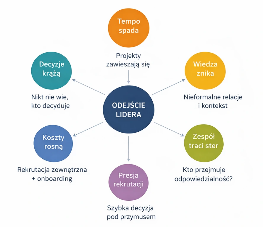 Wraz z odejściem lidera znikają rzeczy, których nie ma w żadnym systemie: sieć relacji, kontekst nieoczywistych decyzji, zaufanie zespołu budowane przez lata. Decyzje zaczynają krążyć, a tematy się przeciągają. Organizacja działa wolniej, niż powinna. Przez chwilę nikt nie wie dokładnie, kto i za co jest odpowiedzialny..